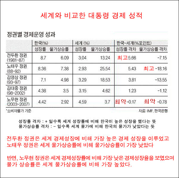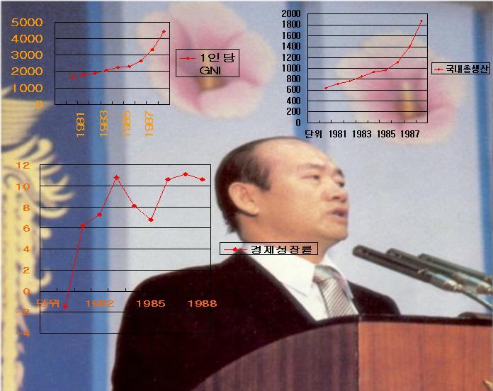 전두환 정부는 물가의 안정과 수출초과, 경상수지 혹자의 성과를 모두 기록하였고 남한이 북한을 경제적으로 확실히 눌러버렸던 때도 이 때였다.